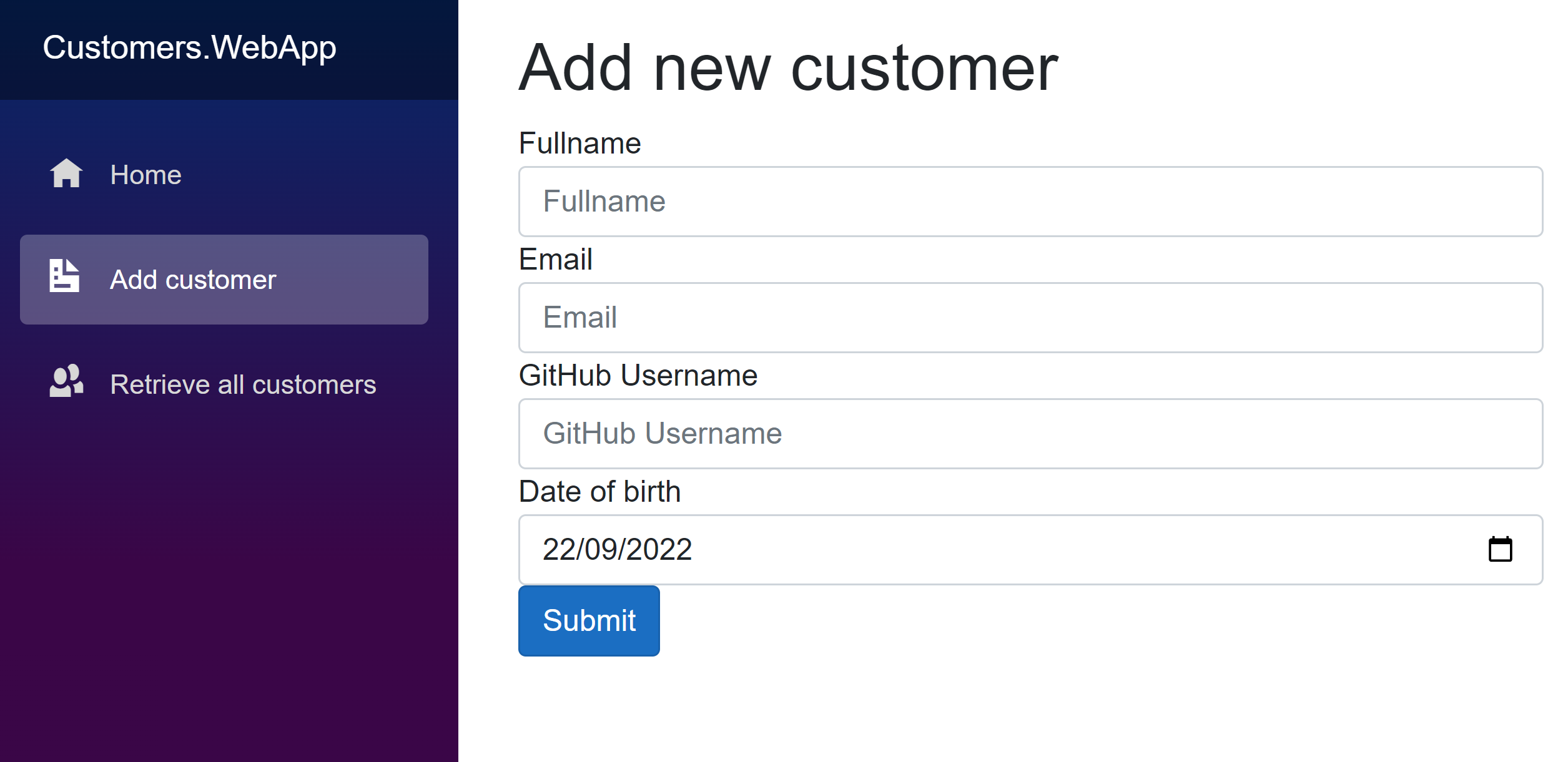 Our goal here is to use Playwright, to automate the creation of a customer. This is the view we are going to automate: