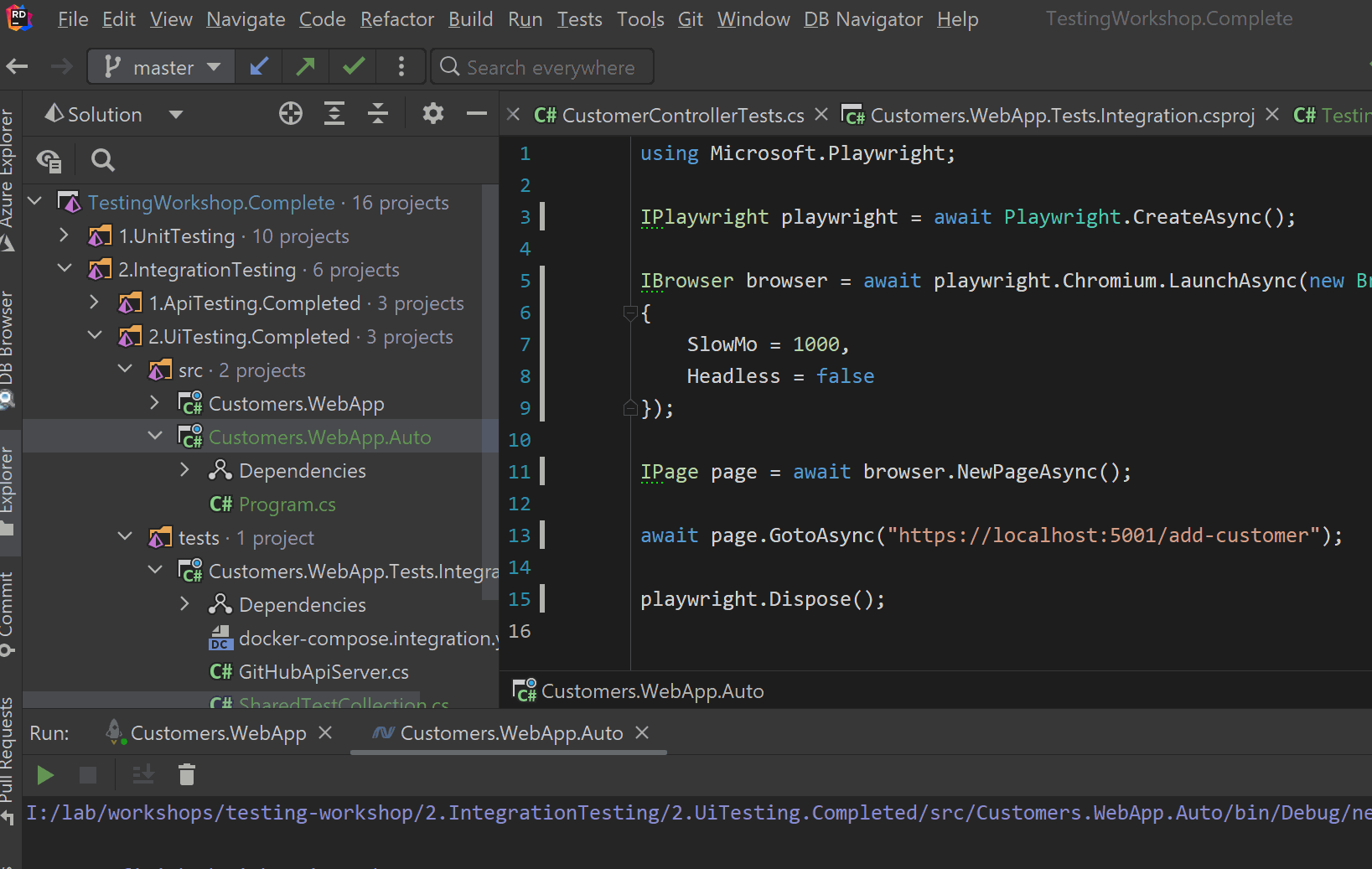 First, let's install Playwright at the Customers.WebApp.Auto project under 2.UiTesting/src.