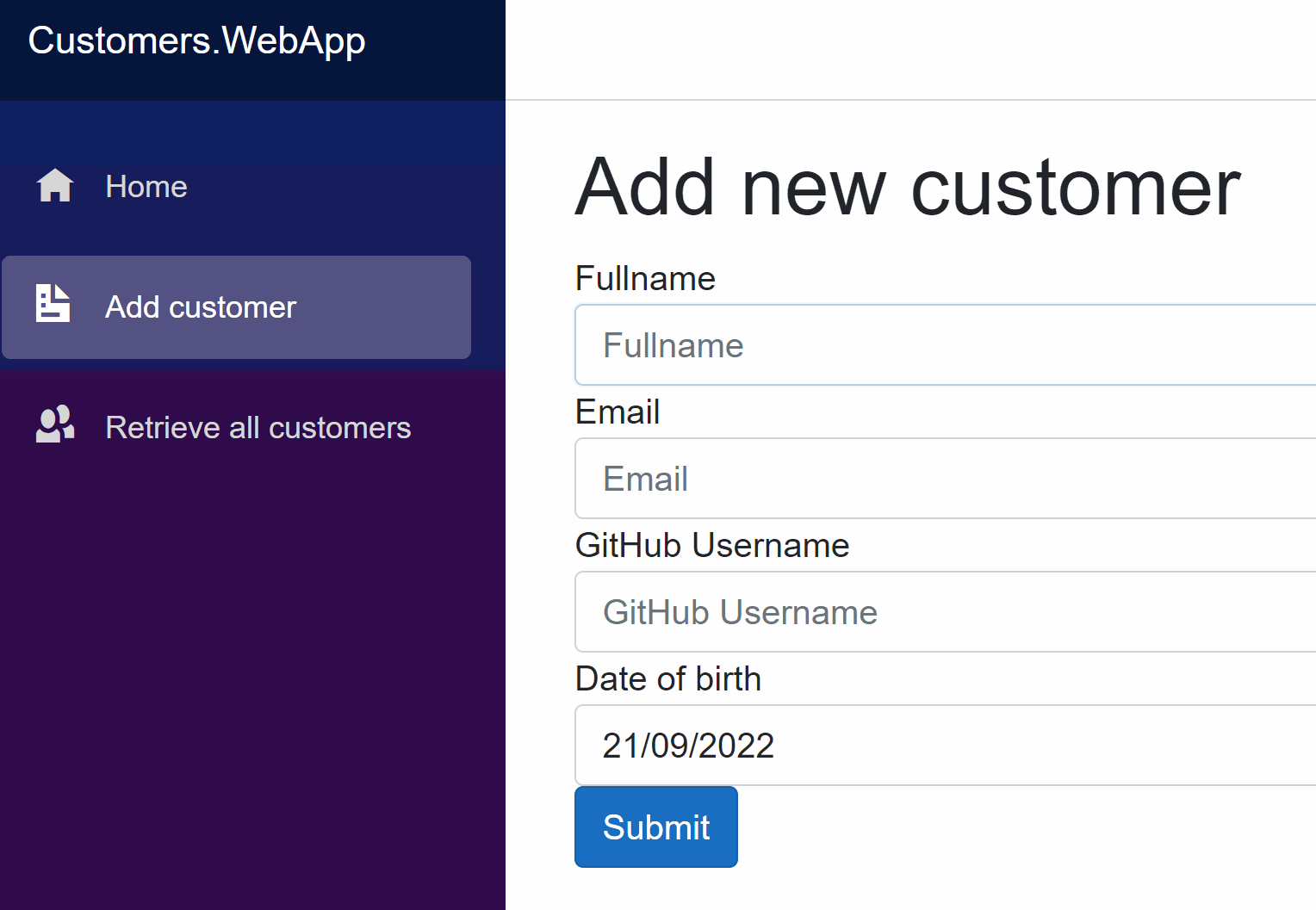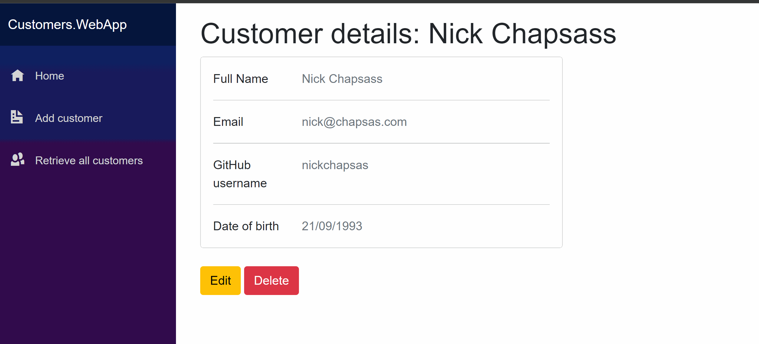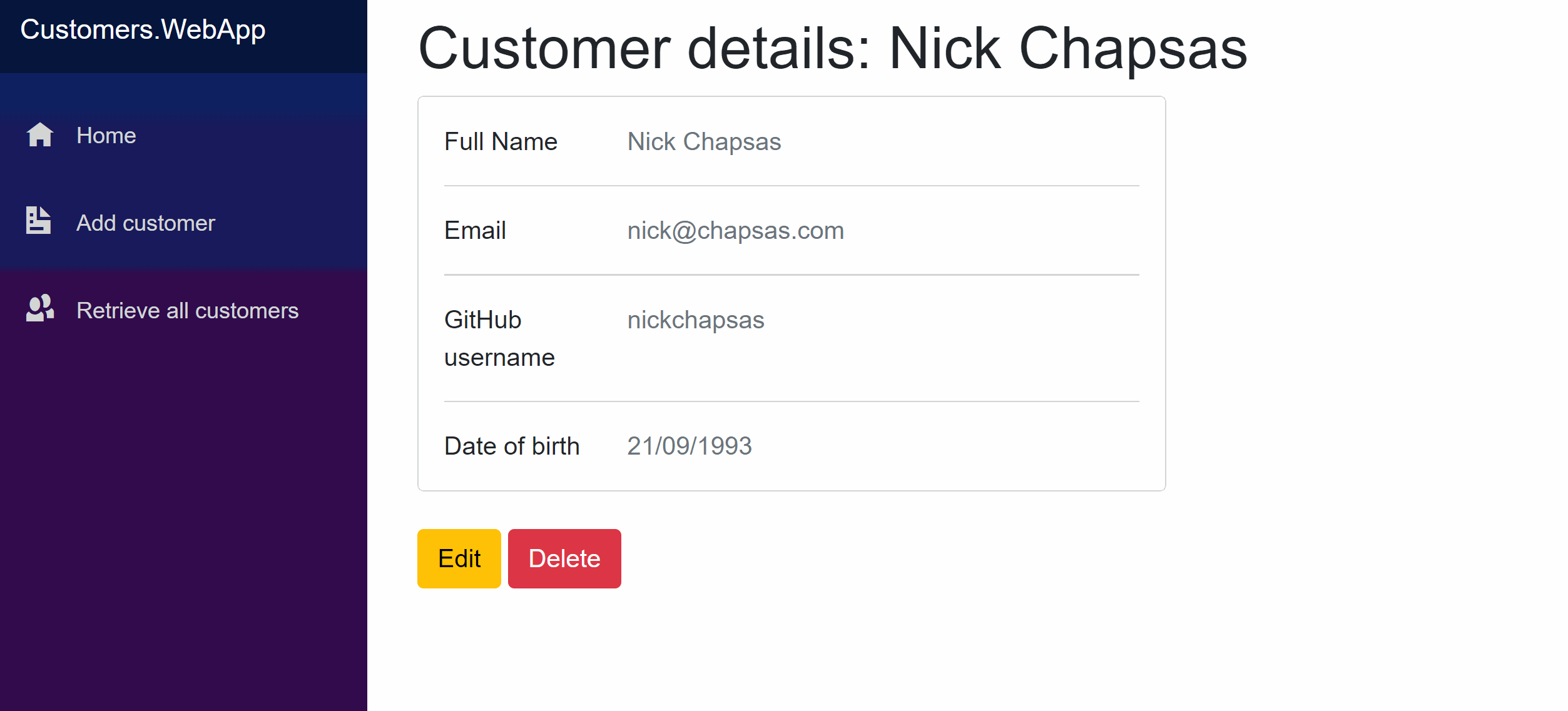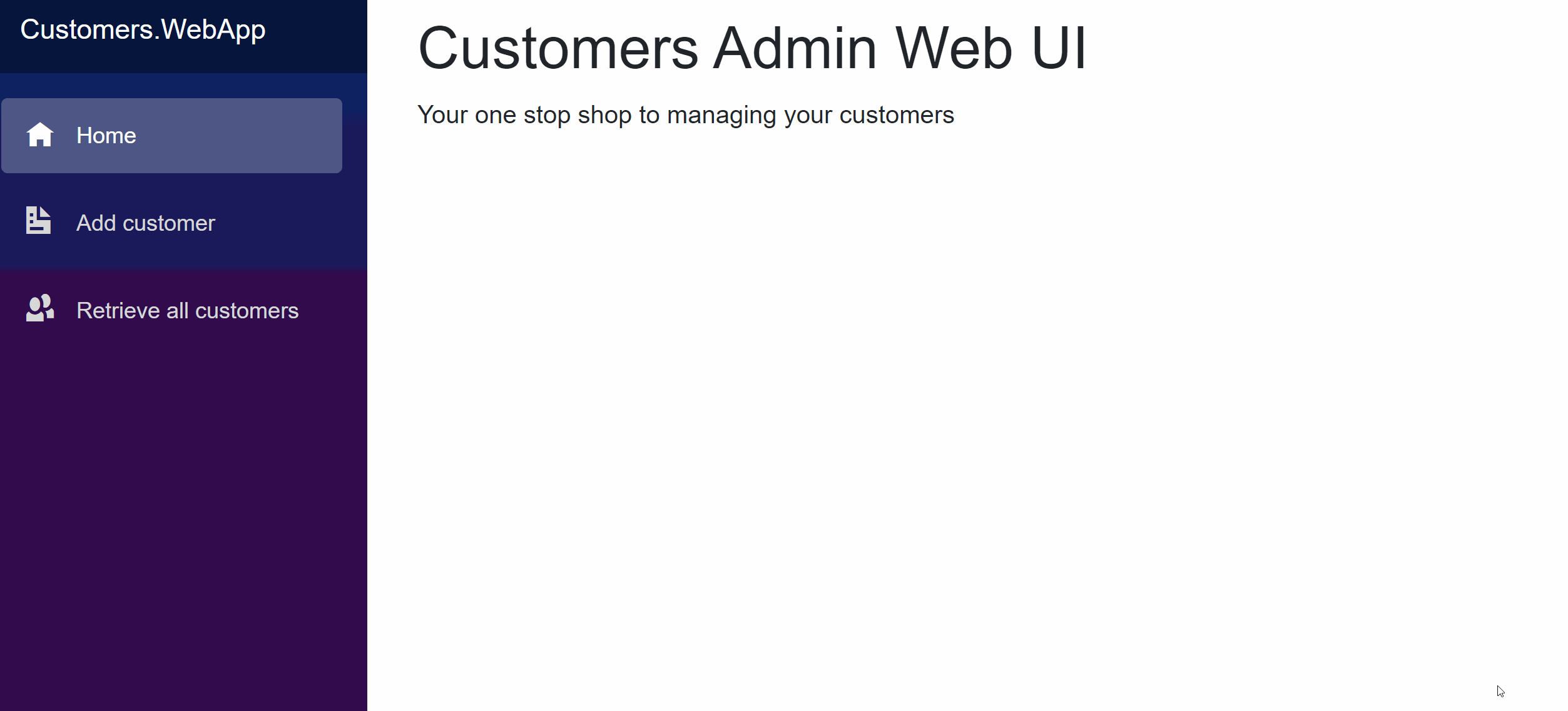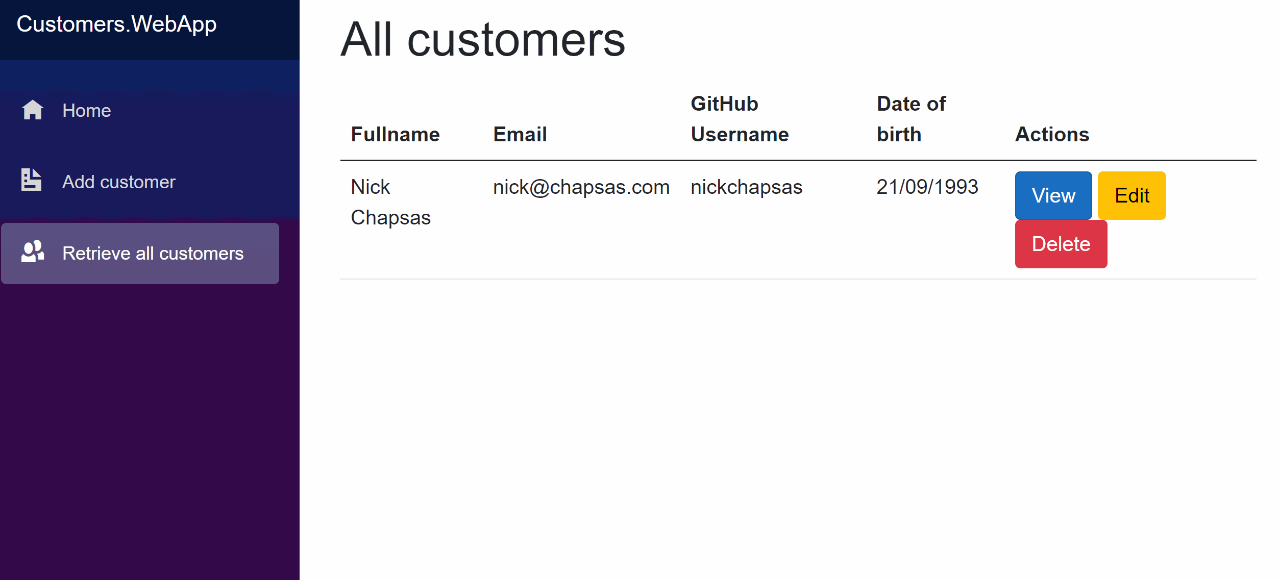 Now let's take a look at the equivalent of the Customers API but in Web App form. This application is written in Blazor, but the technique and approach applies for other .NET technologies such as MVC and even WebForms.